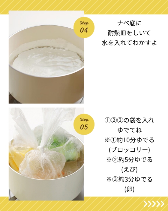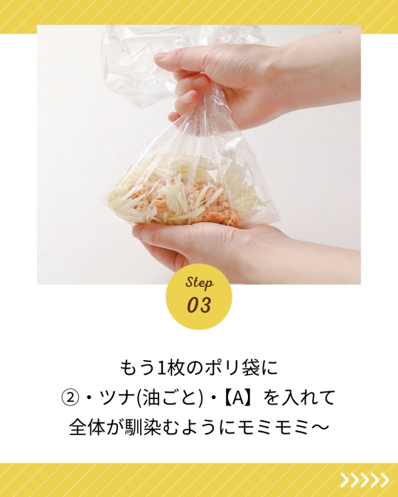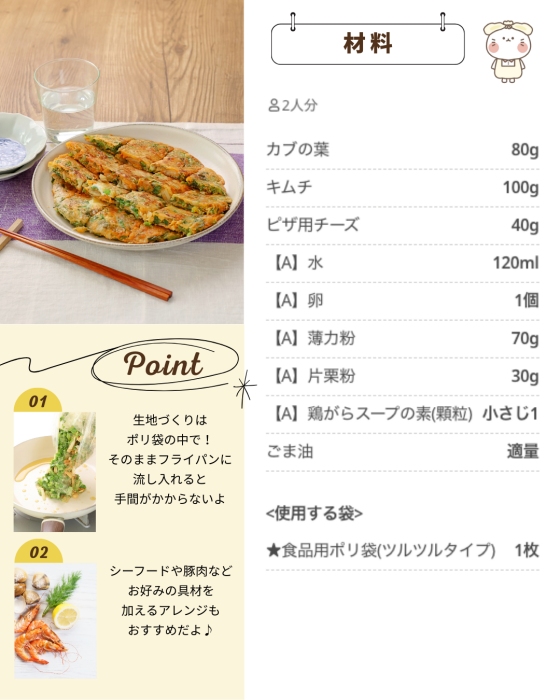 耐熱性のキッチン用ポリ袋を使った湯煎調理や、ジッパー袋を活かした冷凍保存レシピに加え、袋の中で食材を混ぜ合わせてそのまま成形や仕上げに展開するなど、ポリ袋ひとつで下ごしらえから調理まで完結するアイデアを多数提案しました。「こんな使い方があったんだ」と感じていただけるような、意外性と実用性を兼ね備えたレシピ設計を心がけています。